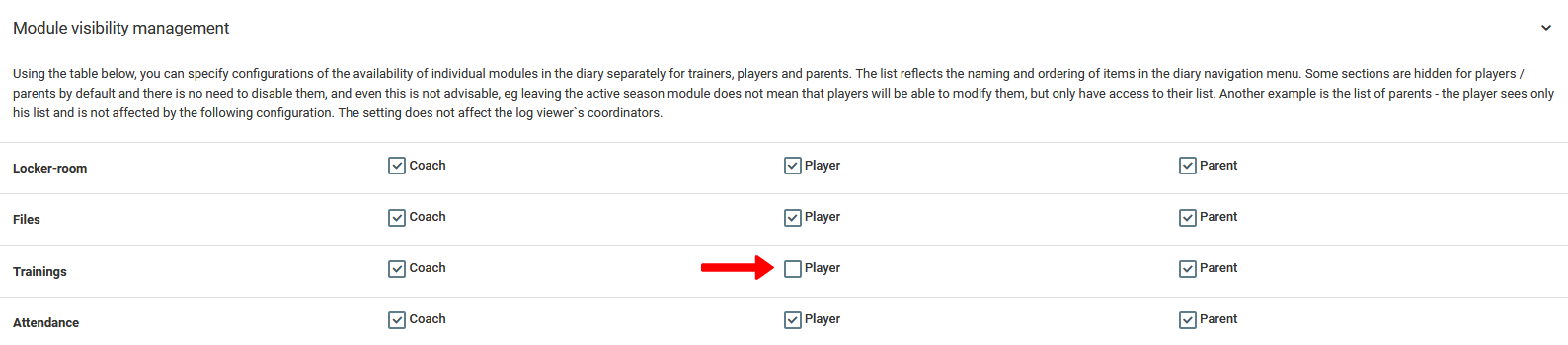 Dalším prvkem nastavení, který ovlivňuje významnou část systému, je modul pro skrývání prvků deníku pro jednotlivé skupiny uživatelů. Pro skrytí nebo zobrazení modulu pro vybranou skupinu uživatelů přejděte v levém menu na klub nastavení skrývání modulů. Jak vidíte na obrázku níže, správa viditelnosti modulů je založena na výběru nebo zrušení výběru zvolených prvků a funkčnosti deníku. Zrušením výběru daného prvku zmizí z menu na účtech vybrané skupiny uživatelů. V případě zobrazeném na obrázku byl hráčům zablokován přístup k záložce tréninků. Pamatujte, že tato nastavení platí pro všechny uživatele z dané skupiny v subjektu, který spravujete.