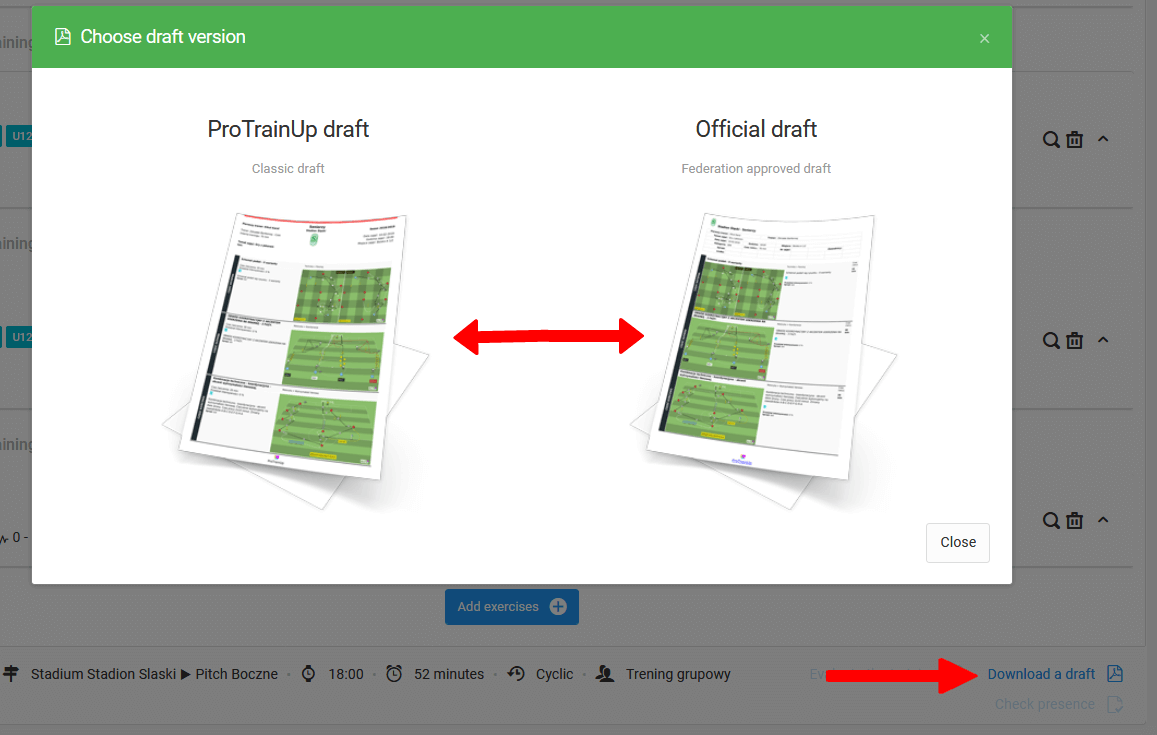 Da shranite pdf osnutek, kliknite na gumb "shrani osnutek", ki je lociran pod izbranim treningom v zavihku dnevnik treningi urnik. Nato izberite predlogo osnutka, ki jo želite shraniti na vaš računalnik.